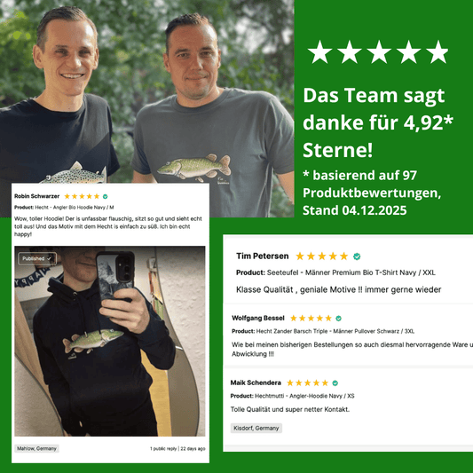 Unsere Bekleidung wird direkt nach deiner Bestellung für dich bedruckt. Unser Partner für den Druck ist einer der Marktführer im Bereich der Bedruckung von Textilien und steht für eine außerordentlich hohe und dauerhafte Druckqualität, damit du besonders lange Freude an deinem Fin-Buddies-Klamotten hast. Im Bild übrigens unsere Hechtmutti - du kannst sie dir mit dem Button unten näher anschauen.