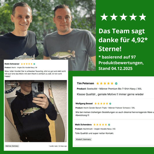 Unsere T-Shirts und Hoodies gibt es nur in bester und haltbarer Bio-Qualität. Wir stehen für Anglerfreundschaft zum Anziehen, und eine Anglerfreundschaft hält bekanntlich ewig ;-)
